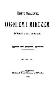 By Fire and Sword (Polish: Ogniem i mieczem) is a historical novel by the Polish author Henryk Sienkiewicz, published in 1884. It is the first volume of a series known to Poles as The Trilogy, followed by The Deluge (Potop, 1886) and Fire in the Steppe (originally published under the Polish title Pan Wołodyjowski, which translates to Lord Wolodyjowski). The novel has been adapted as a film several times, most recently in 1999.