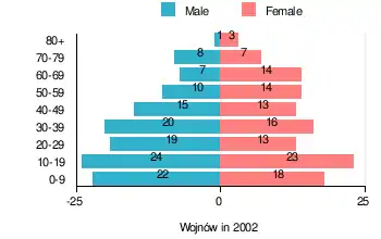 According to the 2002 Poland census, there were 247 people residing in Wojnów village, of whom 51% were male and 49% were female. In the village, the population was spread out, with 31.2% under the age of 18, 36.8% from 18 to 44, 18.2% from 45 to 64, and 13.8% who were 65 years of age or older.[1]
