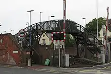 At the southern end of the station there is a footbridge over the railway made from old sections of rail. The footbridge is over 130 years old, and was built after two deaths at the station's level crossing in 1886. It is now Grade II listed[7] and is believed to be the only one of its type left in the UK. In 2017, various defects were found in the bridge's structure and Network Rail started restoration work in 2021 after initially having a planning application rejected.[8][9][10]