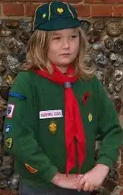 The Wolf Cub uniform is a green jumper and group scarf (neckerchief), a cap, or beret for girls, with grey short trousers.