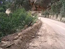 A typical unsealed section of Wombeyan Caves Road, showing sandstone outcrops and lack of guardrails | |