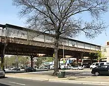 The Woodhaven Boulevard station is an elevated station on the BMT Jamaica Line of the New York City Subway, located in Woodhaven, Queens.[4] It is served by the J train at all times and the Z train during rush hours in the peak direction.[5] As of December 2023, the westbound platform is temporarily closed.