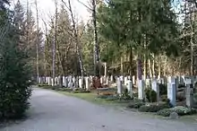 A woodland cemetery is a cemetery where the original landscape, with existing trees, is given much influence on the landscape architecture of the cemetery. A woodland cemetery is designed so that the landscape is given a more prominent position, and grave monuments, chapels and other buildings are given less prominent positions. The trees of the cemetery might originally have been a woodland or a tighter forest where a portion of the trees have been removed, and some of the trees might be planted as well.