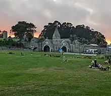 The Masonic Grand Lodge of California laid the cornerstone for the cemetery during a ceremony held on October 29, 1904 at a 47-acre (19 ha) site formerly used as the Seven Mile House on the stagecoach route linking San Francisco and San Jose.[2]: 117 The entrance to the cemetery is marked by two prominent arches; T. Paterson Ross was responsible for designing the original entry arch, which was built with blue granite blocks quarried from Raymond, California. A second arch was added in the 1930s alongside administrative offices, a columbarium, mausoleum, and chapel, designed by William G. Merchant and Bernard Maybeck.[2]: 118
