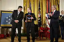 Keeble's stepson Russell Hawkins (center) accepts the Medal of Honor from President Bush on March 3, 2008