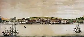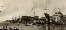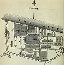 Woolwich Dockyard (formally H.M. Dockyard, Woolwich, also known as The King's Yard, Woolwich) was an English naval dockyard along the river Thames at Woolwich in north-west Kent, where many ships were built from the early 16th century until the late 19th century. William Camden called it 'the Mother Dock of all England'.[1] By virtue of the size and quantity of vessels built there, Woolwich Dockyard is described as having been 'among the most important shipyards of seventeenth-century Europe'.[2] During the Age of Sail, the yard continued to be used for shipbuilding and repair work more or less consistently; in the 1830s a specialist factory within the dockyard oversaw the introduction of steam power for ships of the Royal Navy. At its largest extent it filled a 56-acre site north of Woolwich Church Street, between Warspite Road and New Ferry Approach; 19th-century naval vessels were fast outgrowing the yard, however, and it eventually closed in 1869 (though a large part of the site remained in military hands for a further century). The former dockyard area is now partly residential, partly industrial, with remnants of its historic past having been restored.