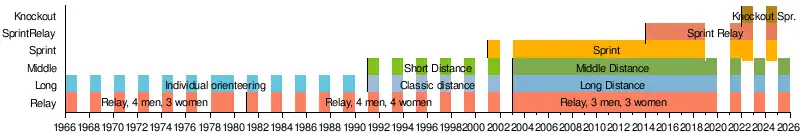 Originally, there were only two competitions: an individual race and a relay. In 1991, a short distance race (roughly 20–25 minutes) was added and a sprint race was added in 2001. The middle distance (roughly 30–35 minutes) replaced the short distance in 2003. In 2014, a sprint relay was added with two men and two women participating and with starting order woman-man-man-woman.