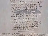 The stadium has a pair of bronze plaques framing the archway and listing the area's war dead during 1917–1919. Close examination of the right-side plaque reveals that there were actually two alphabetical lists. Some sources say that this was a separation of white from "colored" in the conventional practice of the segregation era. The marker between the two lists was later roughly chiseled away.