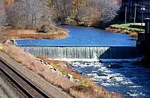 This dam is 10.5 mi (16.9 km) downstream from the Quaboag River head at Quaboag Pond. It is the second dam of a two dam complex. Destroyed by a flood in the mid 1950s, the upper dam was never rebuilt. Because of its height, this dam is unrunnable by local kayakers and requires mandatory portage around it. A recent survey shows that this dam is capable of producing 830 kW of electricity continuously.[1] This means that it could produce 1.6 MWh of clean electricity annually.[1]