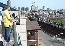 In 2002, the Cubs organization filed a lawsuit against the different facilities for copyright infringement. Since operators charge admission to use their amenities and sell licenses to view Major League Baseball, the Cubs asserted that the facilities were illegally using a copyrighted game and sued for royalties.[6] In 2004, 11 of the 13 roofs settled with the club out of court, agreeing to pay 17% of gross revenue in exchange for official endorsement.[7] The city also began investigating the structural integrity of the roofs, issuing citations to those in danger of collapse. With the Cubs and the neighbors reaching agreement, many of the facilities began to feature seating structures: some with bleachers, some with chair seats, and even one with a steel-girdered double deck of seats (see photo). The agreement was to last until 2023.[8]