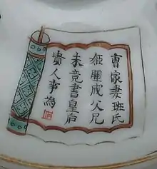 Wu Shuang Pu (Chinese: 無雙譜; lit. 'Table of Peerless Heroes') is a book of woodcut prints, first printed in 1694, early on in the Qing dynasty. This book contains the biographies and imagined portraits of 40 notable heroes and heroines from the Han Dynasty to the Song Dynasty, all accompanied by a brief introduction and guided by a related poem in yuefu style.[1][2] The illustrations from the book were widely distributed and re-used, often as motifs on Chinese porcelain.[3][4]