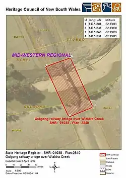 - 1 2 "Gulgong railway bridge over Wialdra Creek". New South Wales State Heritage Register. Department of Planning & Environment. H01038. Retrieved 2 June 2018.