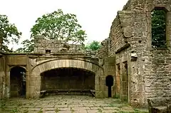 Despite this, much of the hall survived into the late 19th century, though it was unoccupied and steadily crumbling, with considerable amounts of the stonework being removed for local buildings.[1] The entire village subsequently passed into the ownership of the local Water Board, but continued to decline. A local conservation group, 'The Friends of Wycoller' was founded in 1948, and began a campaign to conserve the historic village. Their work on the hall included the restoration of the fireplace in the 1950s.[1] The entire area was sold in 1973 to Lancashire County Council, which declared the entire village a conservation area, and designated the surrounding 350 acres (1.4 km2) as a Country Park. The ruins of the hall were designated as a scheduled monument and are Grade II* listed.[4] An exhibition about the history of the hall, the village, and the surrounding area was established in the aisled barn close to the ruins.
