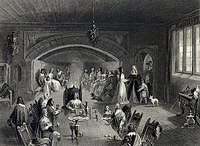 The seasonal celebrations shown in the above engraving (from a painting by Henry Melville) are the subject of Letitia Elizabeth Landon's poetical illustration Christmas in the Olden Time, 1650 in Fisher's Drawing Room Scrap Book, 1836.[8]