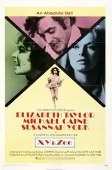 X Y & Zee (also known as Zee and Co. and Zee and Company) is a 1972 British drama film directed by Brian G. Hutton and starring Elizabeth Taylor, Michael Caine, and Susannah York. Released by Columbia Pictures, it was based upon a novel by Edna O'Brien.[1] The screenplay concerns a middle-aged, bickering couple whose marriage is near its end, and the woman who comes between them.