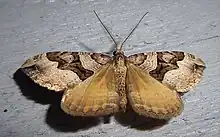 The expansion of the wings is about an inch. The fore-wings of the male are pale pink; there are several wavy brown lines near the base, a very distinct brown central band, narrowest near the middle, but much broader on the costa than on the dorsum ; the centre of this band is paler towards the costa ; the termen is shaded with brown, except near the apex of the wing ; the veins are dotted in black. The hind-wings are bright ochreous with numerous wavy darker lines. The female is darker in colour than the male, the central band is broader; there are numerous brown and pink wavy lines on each side of the central band, and the principal veins are marked in pale ochreous. The grey transverse lines on the hind-wings are much more distinct in the female than in the male.[6]