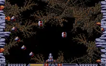 The Master System version of the game was programmed by Sean Cross and S. Green,[11] was released in October 1991 and has a reduced level count from five to three.[12] In November 1991, Epic/Sony Records also published versions for PC-98 and X68000 in Japan.[13][14][15][16][17] The Sega Genesis version was programmed by Delvin Sorrell and released in February 1992.[18][19] The Master System and Mega Drive versions were published by Virgin Games.[11][19] The Game Boy version was published by Mindscape and released in October 1992.[20] A version for the Commodore CDTV, also programmed by Sorrell, was released in the same month, and includes a high fidelity remix of "Megablast" as well as voice acting for the character Crispin provided by Richard Joseph.[21][22] A version for the SNES was announced the following month, but not released.[23] A version for the Acorn Archimedes and other Acorn 32-bit machines was released in late 1993, published by GamesWare.[24] On May 27, 2016, a version for the Atari Jaguar, created by AtariAge user Cyrano Jones, was released with Mike Montgomery's blessing. The Atari Jaguar version includes a new soundtrack composed by 505.[25][26][27]