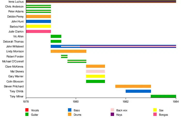 - John Willsteed (aka John e) – bass guitar (1979–84), vocals (1980–84), guitar and keyboards (1981–84)
