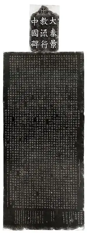 The Xi'an Stele or the Jingjiao Stele (Chinese: 景教碑; pinyin: Jǐngjiào bēi), sometimes translated as the "Nestorian Stele," is a Tang Chinese stele erected in 781 that documents 150 years of early Christianity in China.[1] It is a limestone block 279 centimetres (9 ft 2 in) high with text in both Chinese and Syriac describing the existence of Christian communities in several cities in northern China. It reveals that the initial Church of the East had met recognition by the Tang Emperor Taizong, due to efforts of the Christian missionary Alopen in 635.[2] According to the stele, Alopen and his fellow Syriac missionaries came to China from Daqin (the Eastern Roman Empire) in the ninth year of Emperor Taizong (Tai Tsung) (635), bringing sacred books and images.[3] The Church of the East monk Adam (Jingjing in Chinese) composed the text on the stele.[4] Buried in 845, probably during religious suppression,[5] the stele was not rediscovered until 1625. It is now in the Stele Forest in Xi'an.