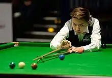 At the Australian Goldfields Open, Xiao recorded wins over Liam Highfield, Peter Ebdon and Matthew Stevens to reach the semi-finals of a ranking event for the second time, where Judd Trump defeated him 6–3.[25][26] He beat Eden Sharav and Noppon Saengkham at the International Championship, but lost 6–4 to Robert Milkins in the third round and was knocked out by the same scoreline in the second round of the UK Championship against Matthew Selt.[27] After edging Highfield 5–4 in the first round of the German Masters, Xiao was thrashed 5–0 by Neil Robertson.[28] Xiao won five matches at the Shoot-Out, the tournament where every match is decided by one ten-minute frame, to reach the final. Xiao lost the lead with just six seconds remaining against Michael White.[29] He progressed through to the final qualifying round of the World Championship and his match against Jimmy Robertson went into a deciding frame which Robertson won on the final pink.[30]