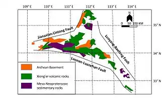 The Xiong'er Volcanic Belt is made up of four geologic formations which include one sedimentary and three volcanic units.[3][4] Starting at the bottom is the sedimentary Daguish formation and above it are the three volcanic formations, which consist of the Xushan, Jidanping, and Majiahe.[1][2][3][4] They unconformably overlie the Archean to Paleoproterozoic formations which make up the basement rock in the area, and they lie unconformably below the meso-Neoproterozoic sedimentary rocks, which include sandstones and limestones.[3][4]