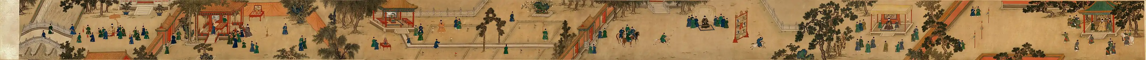 - ↑ This painting measures 211 centimeters in height and 353 centimeters in width. It depicts the scene of the Xuande Emperor going on a hunting trip. In the painting, a group of people and horses can be seen entering the forest. The trees on the hill are lush with flowers, and the stream flows gently. Birds and animals can be seen walking in pairs among the trees. The Xuande Emperor leads the procession, with a tall and dignified figure. He wears a black pointed hat, a red narrow-sleeved shirt, and a yellow long coat. The image of the Xuande Emperor is slightly larger than the others, a common technique used in ancient figure paintings to highlight the importance of the main character. The composition of the painting is well-structured, with a mix of ups and downs and a balanced arrangement. The proportions of the background and the people are not entirely realistic, reflecting the unique understanding of spatial concepts by ancient Chinese painters.