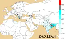 The Haplogroup H (also known as the "Indian marker"[4]), which is a direct descendant of the Upper Paleolithic Eurasian Haplogroup HIJK, is mostly restricted to South Asian populations of the Indian subcontinent,[4] in addition to some populations of South Central Asia and eastern Iranian plateau, where it is found in low frequencies.[5] It originated somewhere in the Middle East or South Central Asia and travelled to Indian subcontinent and adjoining areas of the eastern Iranian plateau around 40,000-50,000 years before present.[4]