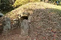 The Yamanoue Kofun is a typical late Kofun period domed tumulus, located about 15 meters on the east side of the Yamanoue Stele. It has a diameter of 15 meters. Neither haniwa nor fukiishi have been found at the site. The tomb has an opening to the south, with a total length of 7.4 meters, with a burial chamber measuring 2.68 by 1.75 meters with a 1.66 meter height. The tomb has been open since antiquity and no grave goods have been found. It is possibly from the same date, or slightly later than the stele, and from the inscription on the Yamanoue Stele, it is assumed that it was the tomb of Kurome-tōji.