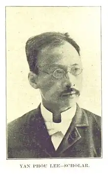 After entering the United States, Yan Phou Lee started his studies at Yale College in 1880, but he was forced to leave the United States by the Chinese government a year later.[3][4] Lee was able to return to the United States in 1885 with the aid of Christian missionaries, and resumed his studies at Yale.[5][6]
