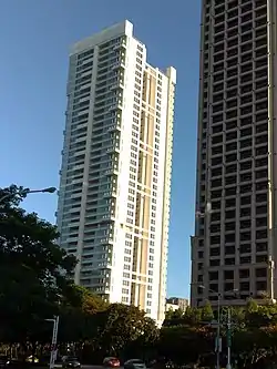 The tower is jointly designed by the American architectural firm Richard Meier & Partners and HOY Architects. The building is divided into two north–south towers, connected through a central core area.[4] The main façade structure of the South Tower is a white translucent glass curtain wall, which allows natural light to enter the building and also allows residents to maintain privacy. There is a public sky garden on the 16th floor of the North Tower, which serves as a viewing platform.[5]