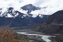 The Yarlung Tsangpo Grand Canyon, also known as the Yarlung Zangbo Grand Canyon, the Tsangpo Canyon, the Brahmaputra Canyon or the Tsangpo Gorge (simplified Chinese: 雅鲁藏布大峡谷; traditional Chinese: 雅魯藏布大峽谷; pinyin: Yǎlǔzàngbù Dàxiágǔ'), is a canyon along the Yarlung Tsangpo River in Tibet Autonomous Region, China. It is the deepest canyon in the world,[1][lower-alpha 1] and at 504.6 kilometres (313.5 mi) is slightly longer than the Grand Canyon in the United States, making it one of the world's largest.[1][3] The Yarlung Tsangpo (Tibetan name for the upper course of the Brahmaputra) originates near Mount Kailash and runs east for about 1,700 kilometres (1,100 mi), draining a northern section of the Himalayas before it enters the gorge just downstream of Pei, Tibet, near the settlement of Zhibe. The canyon has a length of about 240 kilometres (150 mi) as the gorge bends around Mount Namcha Barwa (7,782 metres or 25,531 feet) and cuts its way through the eastern Himalayas. Its waters drop from about 2,900 metres (9,500 ft) near Pei to about 1,500 metres (4,900 ft) at the end of the Upper Gorge where the Po Tsangpo River enters. The river continues through the Lower Gorge to the Indian border at an elevation of 660 metres (2,170 ft). The river then enters Arunachal Pradesh and eventually becomes the Brahmaputra.[4][5]