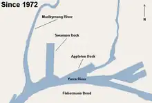 In 1957, the Upper Yarra Reservoir was constructed, primarily to alleviate flooding downstream. This reduced the river's flow to around 50%, where it sits today. Swanson Dock was constructed between 1966 and 1972 equipped for modern container shipping. Shipping activity at Victoria Dock during this time had gone into steep decline and it was almost disused by the mid-1970s. In February 1972, the CBD was flooded as the natural watercourse of Elizabeth Street became a raging torrent.[23] This was due mostly to previous storm water drainage works which utilised Elizabeth street as a watercourse during times of intense rain creating flash floods. Prior to settlements, the area now occupied by Elizabeth street was a gully off the river.