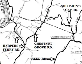 Yarrowsburg sits at the foot of Elk Ridge mountain on the west side of Pleasant Valley, stretching along Reed, Kaetzel and Yarrowsburg roads in southeastern Washington County. Until the late 19th century, Elk Ridge was wholly owned by the Antietam Iron Works. The forest was used as fuel for the furnace and forges after being converted to charcoal. After being harvested and especially after the iron works went bankrupt in the 1850s, the mountain land was sold off in multi-acre lots. Many of the properties in Yarrowsburg are on former iron works property. The village is named for Aquila and Polly Yarrow, free African Americans who bought a small log house on 1 1/4 acres of land in the southeast corner of Yarrowsburg and Reed roads in 1825. The Yarrows were one of several free black families living in Yarrowsburg at the time. It is thought that Aquila worked as a collier for the iron works.[5] Aquila died unexpectedly in 1832, but Polly lived at the village named for her until November 21, 1885. This was also the site of the only (historical) crossing of Elk Ridge mountain through the steep and rocky Solomon's Gap. Elk Ridge can only be passed otherwise by circling around its north or south ends via Trego or Sandy Hook roads. The road through Solomon's Gap was abandoned in the early 20th century and is no longer a through road. Solomon's Gap would play a role in the strategy of the Civil War battles in the area.[6] Yarrowsburg is today a rural village of single-family homes.