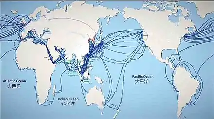 High-capacity and long-distance optical fiber communications in the lowest loss wavelength band of 1.5 micrometers use dynamic single mode lasers (DSM lasers), such as phase shift distributed feedback lasers and wavelength tunable lasers, as their light sources, and have progressed along with research and development of optical fiber, optical devices, modulation schemes, and the like. Phase shift distributed feedback lasers developed by this research have been commercially applied for long distances—for overland trunk systems (1987) and for intercontinental submarine cables (1992) (Fig. 8) —and continue to support the progress of the Internet to this day. Later, since around 2004, wavelength tunable lasers are being used as the light source to advance dense wavelength division multiplexing (D-WDM) systems and optical coherent fiber systems for multi-level modulation schemes. Optical fiber communications make up a highly dense communications network circling the globe tens of thousands of times and are also used in applications such as middle-distance Ethernets. Additionally, DSM[7] lasers in the band of 1.5 micrometers are used for optical lines from the exchange center to the home in FTTH. The transmission performance of fiber represented a by-product of the transmission capacity and the distance has been increased yearly exponentially, as shown in Fig. 9. In such ways, the information transmission capability of optical fiber has reached several hundred thousand times as much as the coaxial cables preceding them and has significantly lowered the cost of transmitting the information. Reflecting this, the mid-1990s saw the network industry such as Yahoo, Google, and Rakuten appear one after the other. Optical fiber communications have progressed and the Internet has developed, and instantaneous transmission of a large volume of knowledge is now a daily occurrence. In 2018, the Internet population reached 39 billion, 52% of the world population. In the electrical communication era of the 1960s, large volumes of data, such as documents on which civilization depend, were circulated slowly in forms such as books. In contrast, the proliferation of high-capacity and long-distance optical fiber communications has allowed for large-volume information such as books to become used interactively in an instant. The research of optical fiber communications contributed to the rapid transition to a civilization based on the information and communications technology.