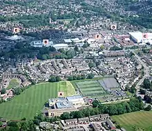 Central Yate from an aircraft (2017), including the Sports Centre, shopping centre, Yate Academy and the Parish Church