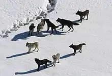 ![]() A Yellowstone wolf pack in winter With temperatures plunging to –40 °C and several metres of snowfall, Yellowstone freezes solid for six months each year. In the extreme cold, moisture in the air freezes, creating diamond dust. The severe winter is the greatest challenge facing the Park's animals, but for the wolf, it is the season of opportunity. The film follows the Druid pack, one of the largest in Yellowstone, as they stalk ever-weakening prey. As herds of elk move to sheltered valleys at the edge of the Park, the wolves lie in wait. Other scavengers such as coyotes and bald eagles also take advantage of wolf kills. On the open plateau, bison are built to endure the worst of the winter, bulldozing their way through deep snow to reach grass. In the harshest winter for a decade, even they are forced to move, following a thermal river to a geyser field. The grass here is laced with silica and arsenic – if the bison stay too long, it will poison them. Aerial shots reveal the tracks of otters and coyotes moving through the snow. The coyote steals a trout stashed beneath the ice of Yellowstone Lake by the otters. The red fox is another year-round resident, listening for and pouncing on mice moving under six feet of snow. By the end of March, winter has loosened its grip, and the emergence of grizzly bears from hibernation in their mountain dens signals the approach of spring. Yellowstone People, produced by Nathan Budd, follows another winter resident, roof shoveler Jeff Henry.[6] | ||||