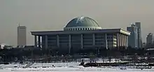 Yeouido is the center of politics in South Korea. The western half of the island dominated by political organisations and their respective buildings. Most prominently, the National Assembly Building is located to the far west of the island. Construction of the building commenced in 1969 and was completed in 1975 and sits atop the site of the former Yeouido Airport. Prior to the opening of the National Assembly Building the seat of government was located at the General Government Building which was situated within the grounds of Gyeungbok Palace.