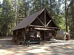 The 1-1/2 story log structure measures 23 feet (7.0 m) by 21 feet (6.4 m), with a prominent front porch, accented by a decorative log truss. The building is an example of the Rustic architecture as it was applied at Yosemite, with strips of cedar bark applied in a decorative pattern.[2]