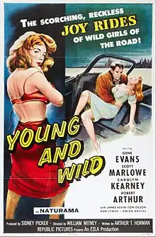 Young and Wild is a 1958 American crime film directed by William Witney and written by Arthur T. Horman. The film stars Gene Evans, Scott Marlowe, Carolyn Kearney, Robert Arthur, Weston Gavin and Tom Gilson. The film was released on April 24, 1958, by Republic Pictures.[1][2][3]