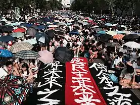 Many Hong Kong youth participate in Hong Kong's pro-democracy movement, and the 2014 Hong Kong protests were led by two student groups: Scholarism and the Hong Kong Federation of Students.[17] In the 2014 Hong Kong protests students rallied outside Hong Kong's government headquarters calling for political reforms to open up nominations for the city's inaugural direct election in 2017.[18] Hong Kong's youth believe their future would be brighter with democracy, since Hong Kong's wealth is concentrated in the hands of a few wealthy citizens, big business greatly influences government policy, there are high property prices, and wages are stagnant.[19]