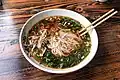 ![]() | Crossing the bridge noodles | 過橋米線 | 过桥米线 | guò qiáo mǐxiàn | Han Chinese | Literally means "crossing the bridge noodles" or "across the bridge noodles". It is Yunnan's best known dish. It typically consists of a bowl of boiling chicken soup, to which diners add their own selection of thin meat slices, mixian, vegetables and spices, much like a hot pot. It is ubiquitous throughout the province. |
