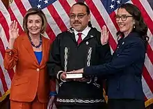 House Speaker Nancy Pelosi (left) swears in Mary Peltola as her husband, Gene (center), looks on. Peltola is Yup'ik from Western Alaska.