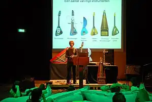 Since 2015, he has built a series of kinetic objects made with motors and pendulums that together operate as a sound installation. He exhibits this project in addition to his on stage performances. 2016 Premier Guitar approached him for the second time for a guitar building request, which resulted in an experimental guitar built for Thurston Moore. Similar to the first project the building process was published as an article in Premier Guitar and he did a 20-minute YouTube interview with Thurston when he handed over the guitar.[15] In the same year he developed a DIY daxophone workshop. In May/June 2017 he was artist-in-residence for one month at iii in The Hague where he developed the motorized sound installation Helicopters.[16] For Lee Ranaldos Lost Ideas Festival in Menen, Belgium he developed a harmonic guitar based on a predecessor, invented by Branca in the early 80s, Ranaldo played in Glenn Brancas orchestra. At the invitation of Harman Kardon he built a 24 string drone sonometer for J.Views during a documentary shoot in the spring of 2018.[17] In October 2018 he published an 8-page musicological essay in Soundest #1 in which he states that the configuration of the musical keyboard is mathematically based, rather than a cultural evolutionairy phenomenon. He shows the pattern in several non-Western scales such as the Indian 22 shruti system, the 19-tone scales on the Iranian tar and the Turkish saz, an out-of-place Coptic artifact and his own tuning system applied on the Moodswinger. This explanation of the origin of the keyboard is in conflict with the Western consensus story that the pattern on the keyboard evolved culturally from originally seven white keys, adding one black key, followed by more into the twelve-tone Halberstadt Keyboard from 1361. In December that same year Musical Instrument Museum put on a large overview exhibition of his invented instruments. In 2019 he build a follow-up series of rhythmic helicopters as a part of Nora Mulder's '7090 Abstraction Parc' that was exhibited at Gaudeamus Music Week, Open NDSM and several other Dutch festivals.