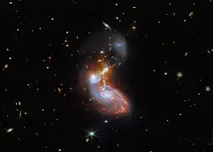 The shape of the merging galaxies is unusual; a number of powerful young starburst regions[3] hang as long, threadlike structures between the main galaxy cores. The system is relatively luminous, but has not yet reached the late stage of coalescence that is the norm for most ultraluminous systems.[1]