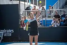 In February, she traveled to Asia, playing at first in Pattaya at the Thailand Open, where she lost at the beginning of the tournament. At the Dubai Tennis Championships, a Premier 5 tournament, she won against two German players, Annika Beck and Andrea Petkovic, before she lost to Ekaterina Makarova in the next round.[16] At the Qatar Ladies Open, she defeated Ons Jabeur in the first round, but Petkovic avenged her early Dubai exit by beating Diyas in the second round.[16][35] At the Indian Wells Open, she got a bye in the first round for being seed No. 28. In the next round, she beat Donna Vekić before losing to Serena Williams.[36][37] At the Miami Open, she also got a bye but lost in the second round to CiCi Bellis.[38]