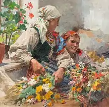 After 1893, he lived in Warsaw. From 1896 to 1897, he painted murals in Saint Petersburg and Moscow. He also did murals at the cathedral in Włocławek and the college in Kalisz.[1] In 1897, he spent some time in Rome, creating ceiling paintings. Four years later, he painted the scene Folk Music on the ceiling of the Warsaw Philharmonic concert hall, which was destroyed by a German bombing in 1939.