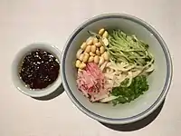Zhajiangmian (Chinese: 炸醬麵; pinyin: zhá jiàng miàn), commonly translated as "noodles served with fried bean sauce",[2] is a dish of Chinese origin consisting of thick wheat noodles topped with zhajiang, a soybean-based sauce. Variations may include toppings of vegetables, beans, meat, tofu, or egg. In the Western press, it is occasionally dubbed "Beijing bolognaise" due to its superficial similarity (both dishes involve noodles with minced meat sauce) and ubiquitous nature.[5]