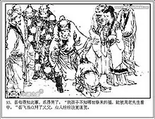 Zhou's portrayal as their teacher is connected to a recurring element in Chinese fiction where Tang and Song dynasty heroes train under a "celestial master", usually a Taoist immortal, prior to their military exploits.[71] C. T. Hsia suggests the mold from which all other similar teachers are cast is Guiguzi, master of the feuding strategists Sun Bin and Pang Juan,[72] from the Yuan dynasty tale Latter Volume of the Spring and Autumn Annals of the Seven Kingdoms (七國春秋後集).[71] Hsia goes on to say that Qian Cai, Yue's fictional biographer, associated Zhou with the outlaws because "most such teachers [in the military romance genre] are celestials" with at least two students.[73] But in adopting this format, Qian reversed the traditional pattern of "celestial tutelage" since Zhou is written as a human, while his students are reincarnations of demons (Lin and Lu) and the celestial bird Garuda (Yue Fei).[74][75]