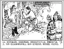 With the publishing of Yue Fei's 17th folklore biography, The Story of Yue Fei (1684), a new, fictional Zhou Tong emerged, who differed greatly from his historical persona. Not only was he now from Shaanxi, but he was Yue's adopted father, a learned scholar with knowledge of the eighteen weapons of war, and his personal name was spelled with a different, yet related, Chinese character.[5] The novel's author portrayed him as an elderly widower and military arts tutor who counted Lin Chong and Lu Junyi, two of the fictional 108 outlaws on which the Water Margin is based, among his former pupils.[6] A later republican era folktale by noted Yangzhou storyteller Wang Shaotang not only adds Wu Song to this list, but represents Zhou as a knight-errant with supreme swordsmanship. The tale also gives him the nickname "Iron Arm", which he shares with the executioner-turned-outlaw Cai Fu, and makes the outlaw Lu Zhishen his sworn brother.[3][5] Because of his association with the outlaws, he is often confused with the similarly named outlaw Zhou Tong.[7]