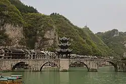 Zhusheng Bridge (Chinese: 祝圣桥; pinyin: Zhùshéng Qiáo) is a large stone arch bridge in Zhenyuan County, Guizhou, China. The bridge over the Wu River. It is 135 m (443 ft) long and 8.5 m (28 ft) wide. A Chinese pavilion named "Zhuangyuan Pavilion" (状元楼) or "Kuixing Pavilion" (魁星阁) on the bridge.[1]